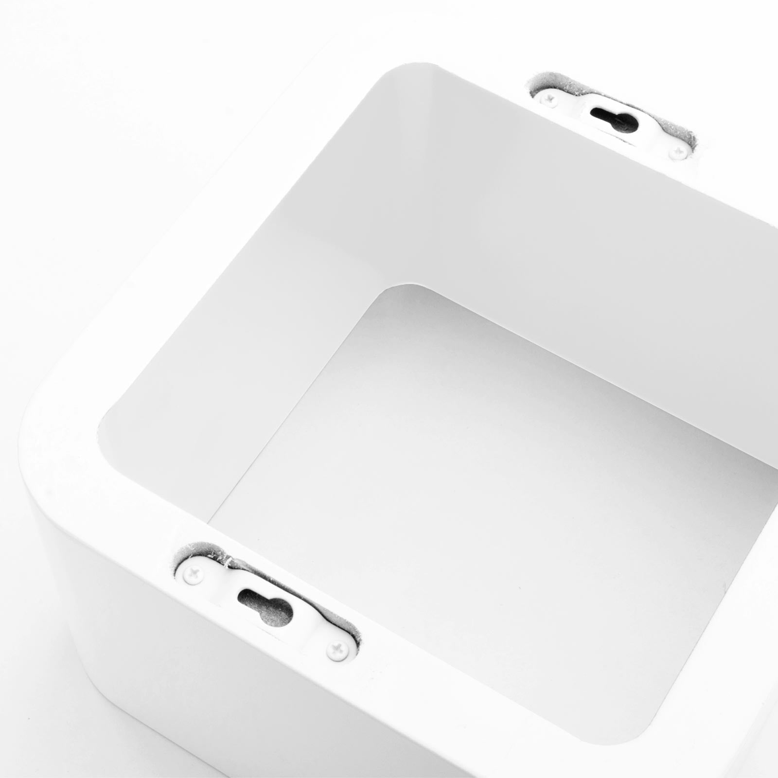 Ausgestattet mit einer nicht sichtbaren Aufhängung an der Rückseite, erwecken die Cube-Regale einen freischwebenden Eindruck. Die hochglanzlackierte Oberfläche verleiht den Retro-Regalen ein sehr edles Erscheinungsbild. Erhältlich ist das 3er-Set in vier Farben: in klassischem Weiss oder Schwarz sowie in den zweifarbigen Ausführung Weiss-Orange oder Weiss-Lila.