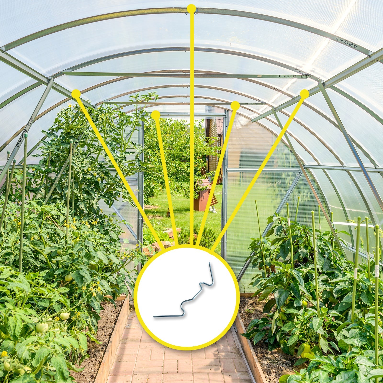 Durch die hohe Rostbeständigkeit unserer Gewächshausklammern, weisen diese eine lange Lebensdauer auf und können daher auch mehrfach wiederverwendet werden. Zudem lassen sich unsere Gewächshausklammern aus Eisendraht einfach und schnell montieren. Die Clips, dienen z.B. als Zubehör für die Befestigung von Doppelstegplatten für den Gewächshausbau, können aber auch zur Stabilisation Ihres individuellen Projekts genutzt werden.